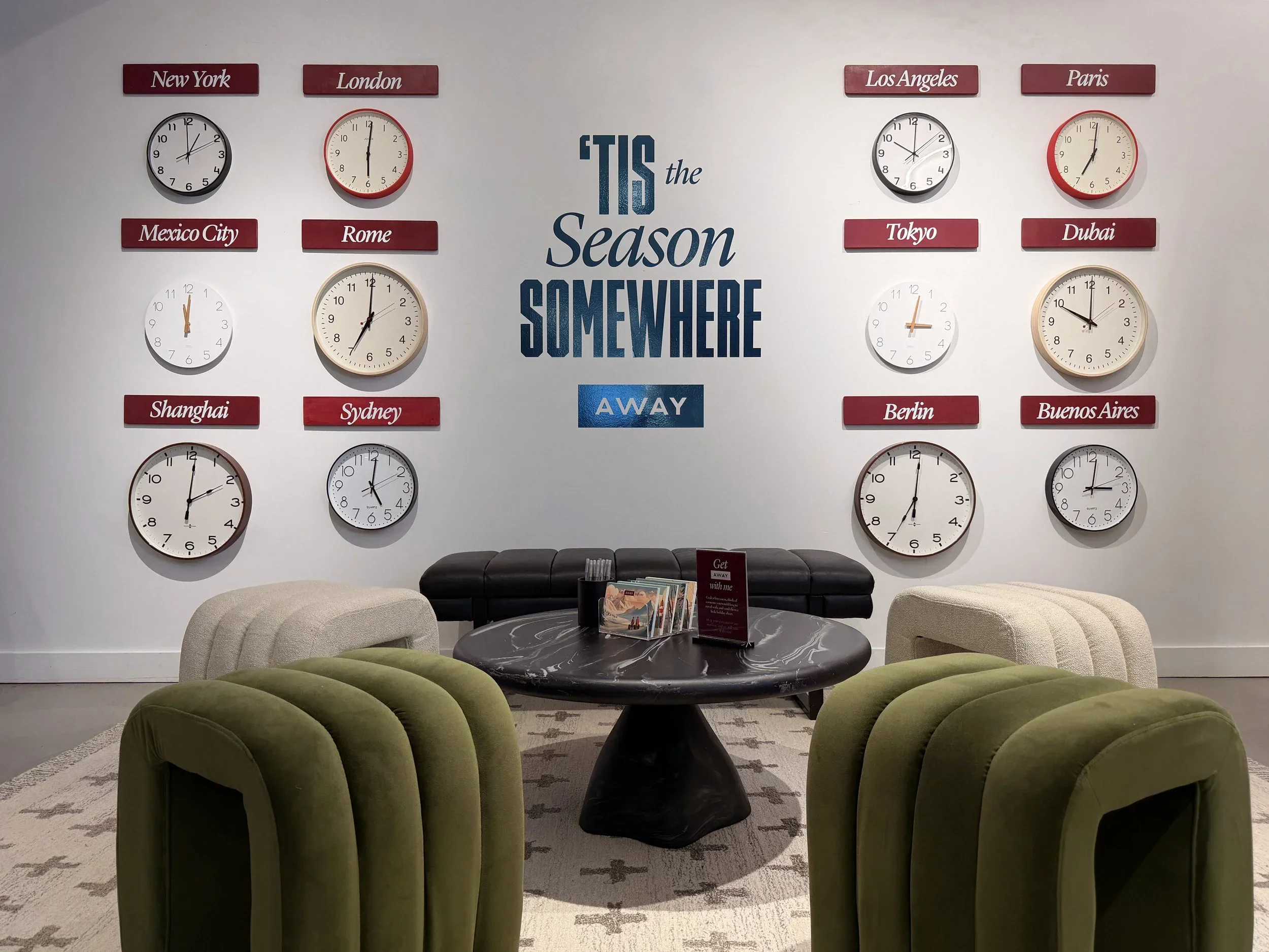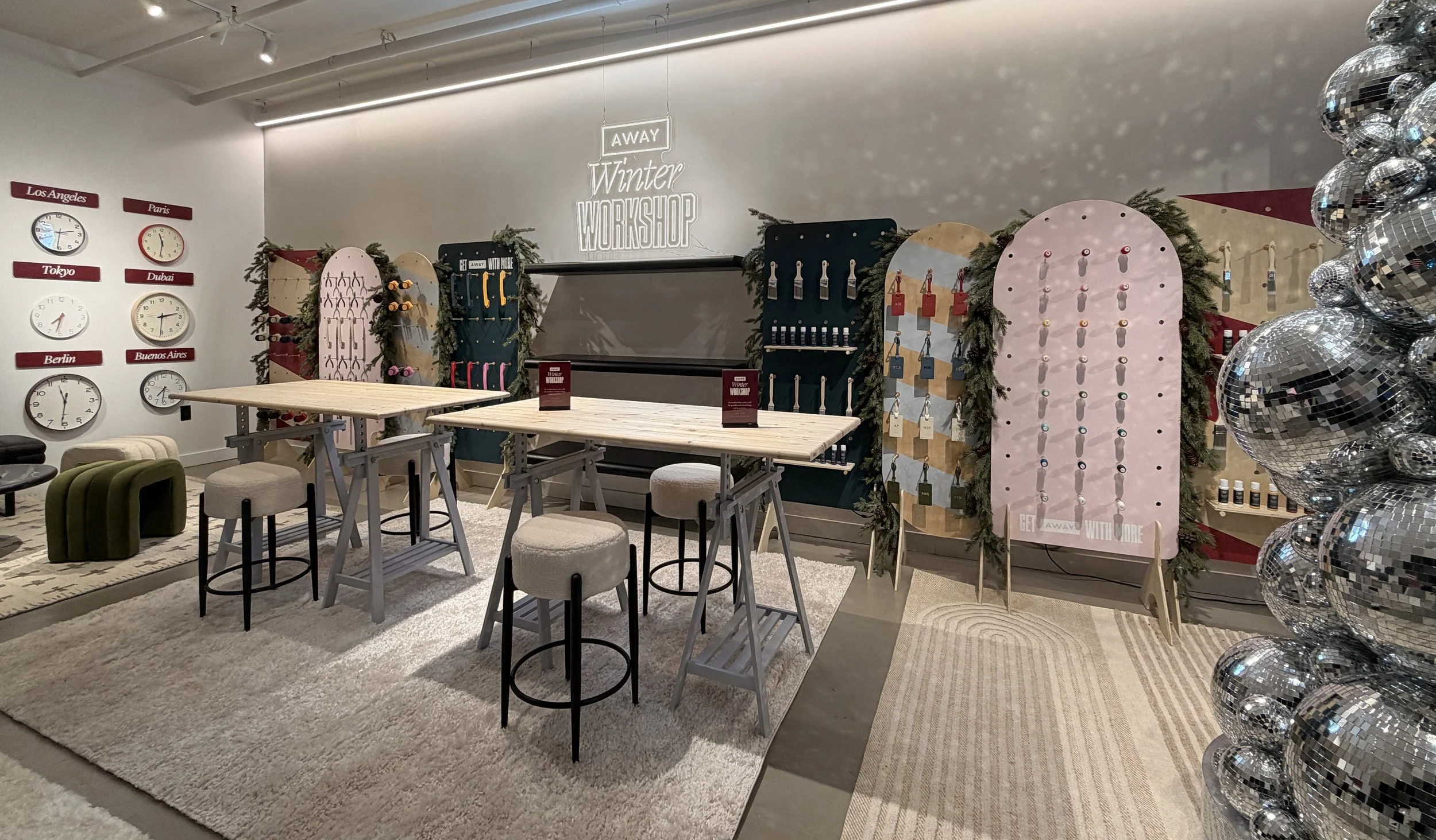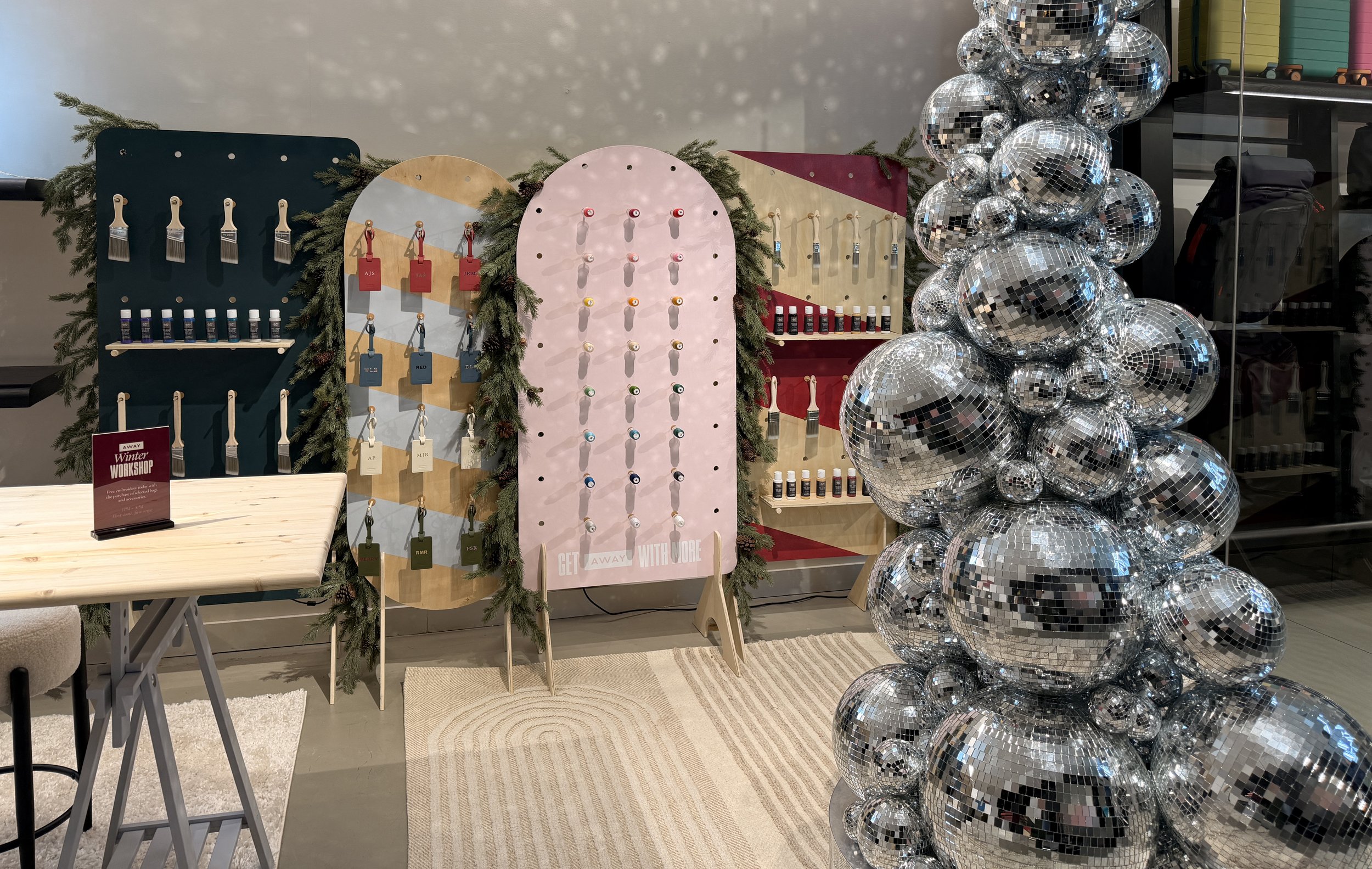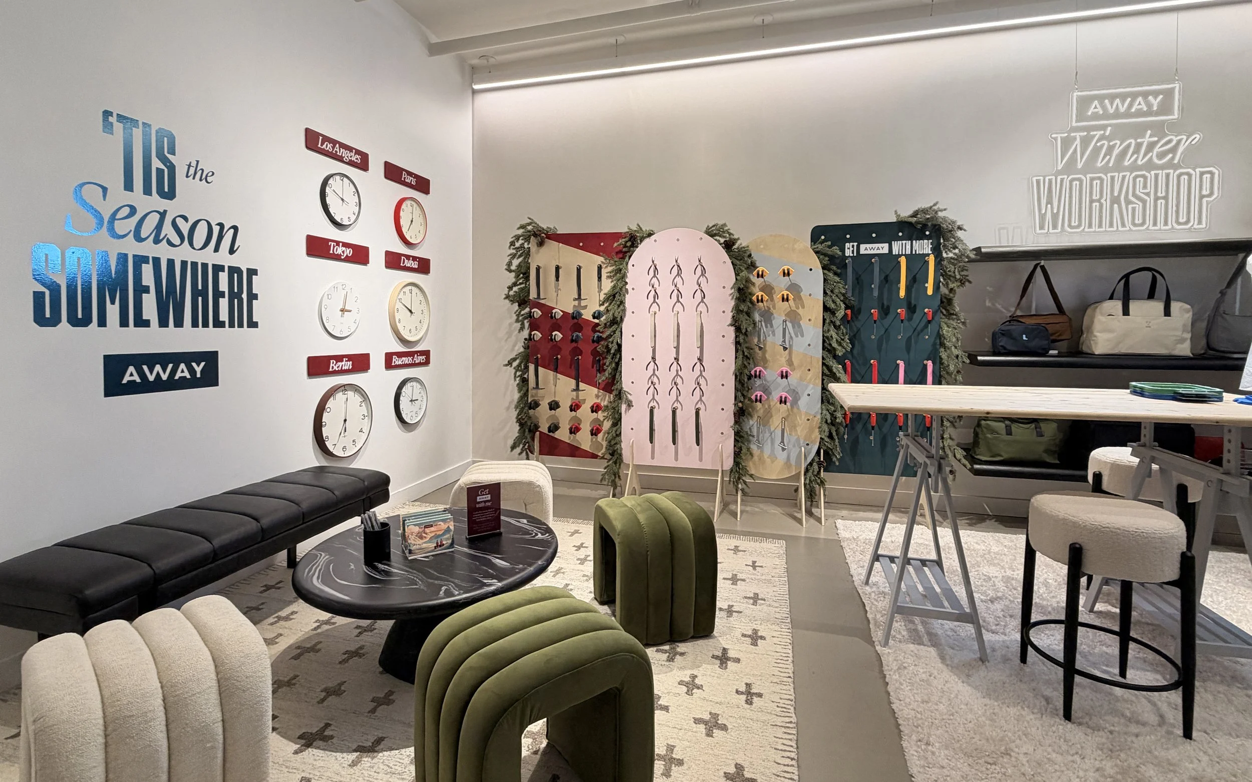 For the holiday season, we transformed Away’s Williamsburg store into Winter Workshop—a festive, hands-on studio centered around customization, craft, and connection. Designed as both retail activation and seasonal escape, the experience invited guests to slow down, personalize their luggage, and step into a tactile winter world.