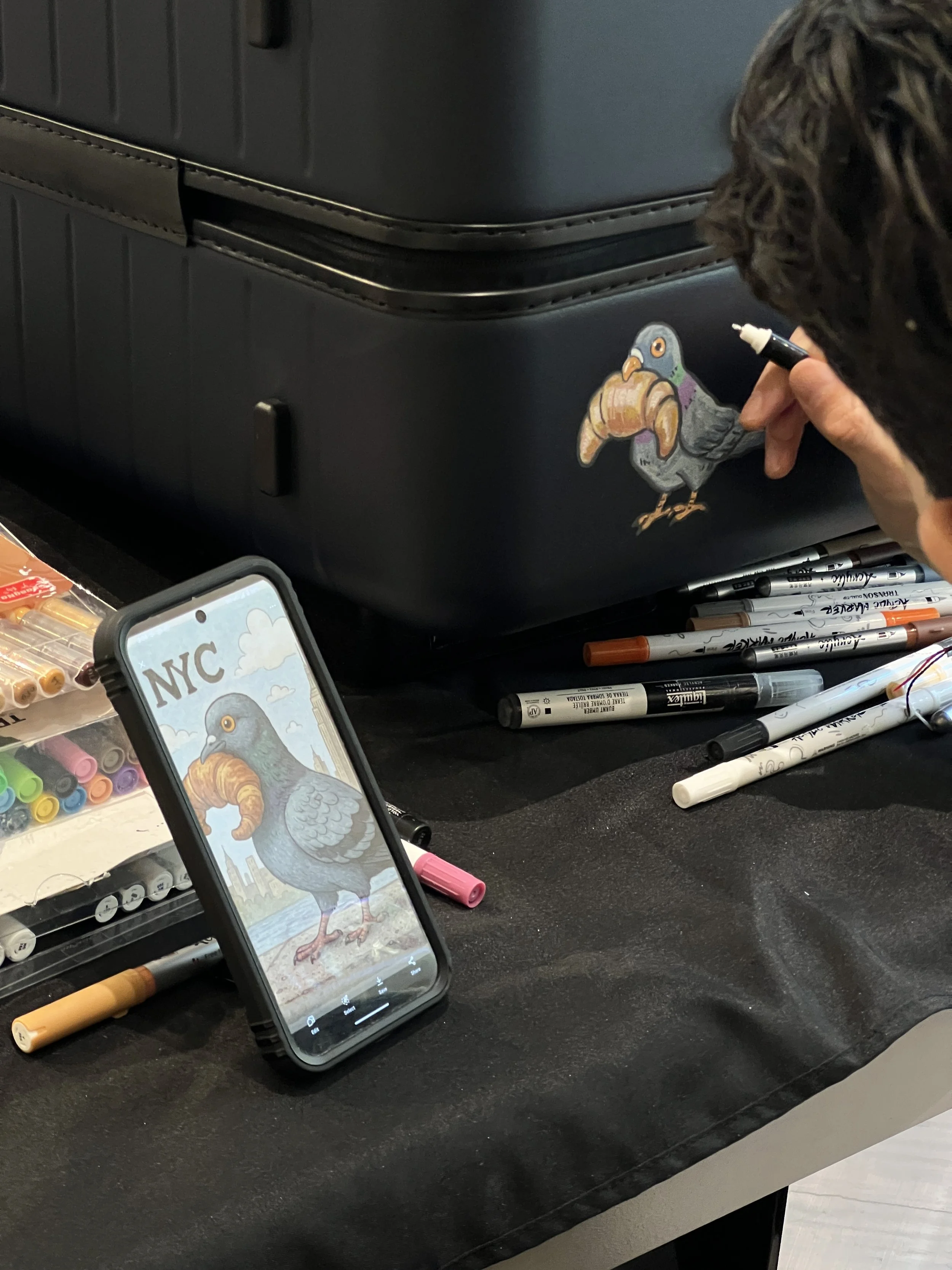 At the core was live customization. Visitors could swap in colored wheels and handles, commission hand-painted illustrations on hard cases, and embroider soft luggage on site. The store shifted from showroom to working atelier, making the act of personalization visible, social, and celebratory.