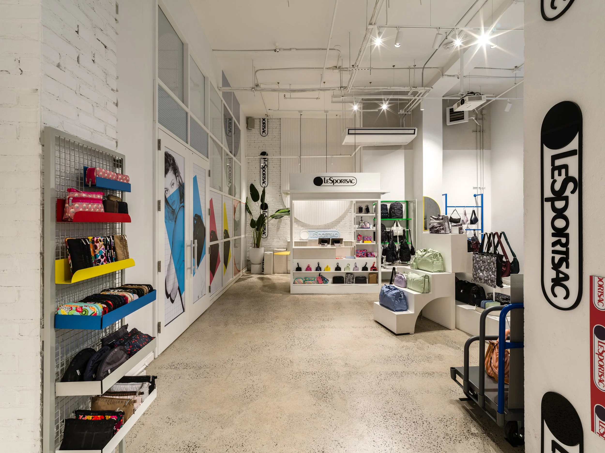 The fixtures translate LeSportsac’s playful identity into sculptural merchandising elements, giving the store new visual rhythm while allowing flexibility for evolving collections and collaborations. Drawing on ideas first explored in our temporary installations for the brand, the system brings a sense of discovery and movement to the everyday retail experience.