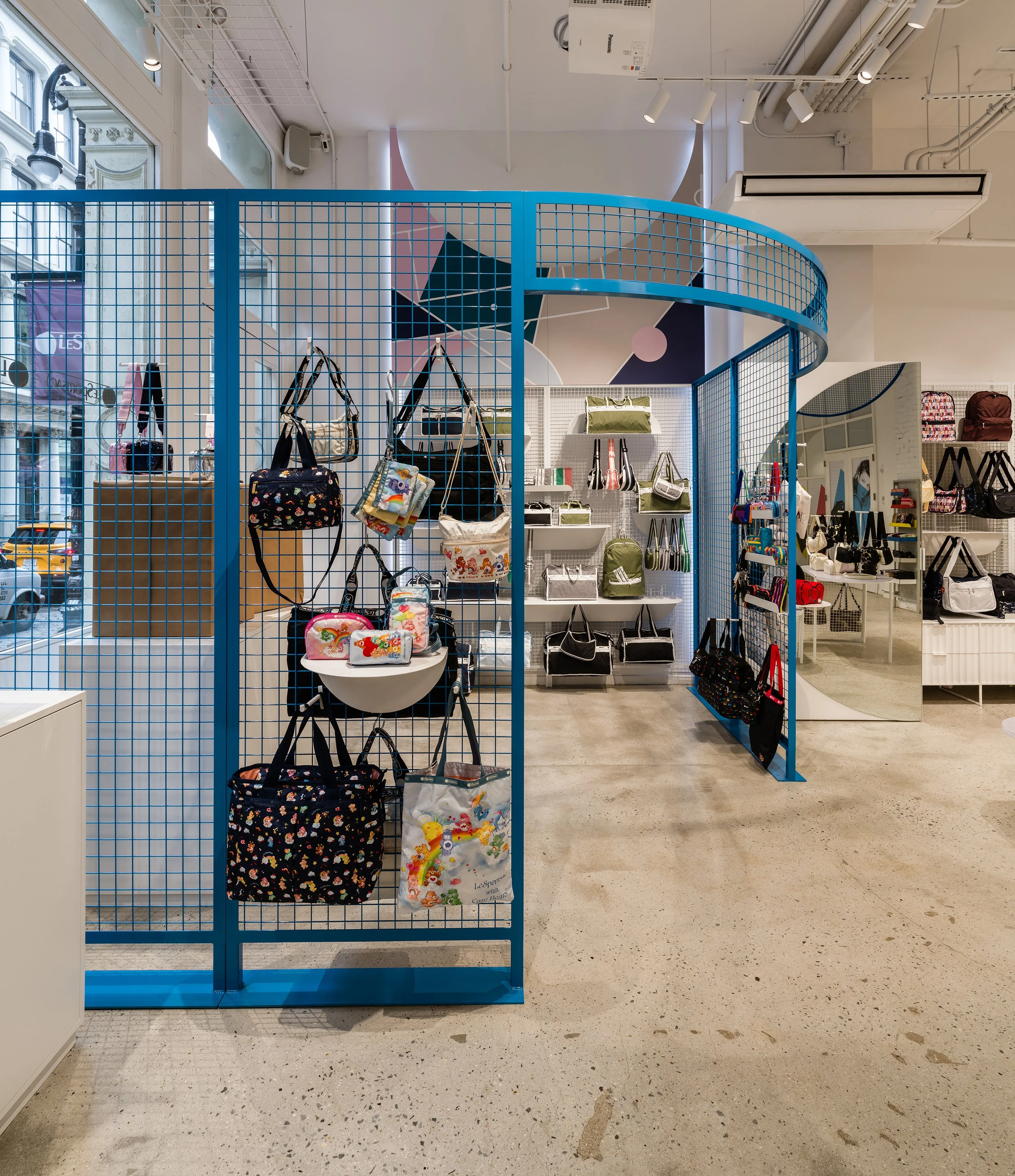 Years after designing LeSportsac’s global fixture system and their Soho flagship, we returned to refresh the space with a new layer of color, movement, and adaptability. The update drew directly from our design work for the brand’s pop-ups, window activations, and showroom—bringing the experimental energy of those temporary environments into the permanence of the flagship.